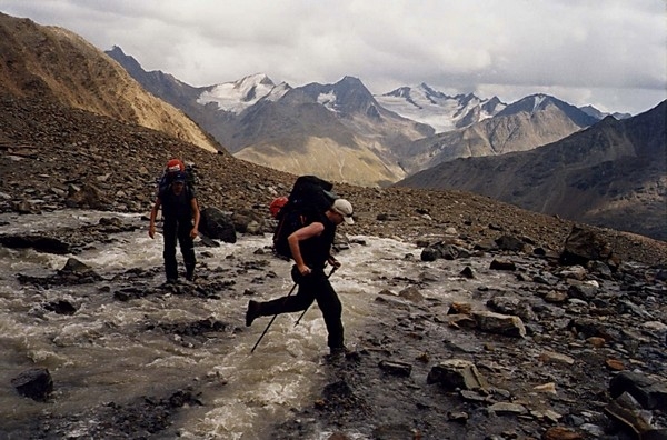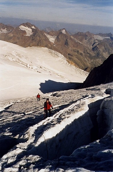 Zpět ke stanu to šlo rychle, udělali jsme nějaké fotky s trhlinami, kvůli jedné takové jsem nechal našeho nováčka Tankarda trčet nad jednou z trhlin (musí se přece otrkat chlapec :), navíc o něco níže jednu trhlinu přeskočil stylem „sandokan“, tak co! U stanu jsme byli v 11:00, odpočinek, ukuchtit něco dobrého k snědku a potom směrem na Vernaghütte (2.755 m), po cestě jsme si vyskočili na Petersenspitze (3.482 m), dále sedlem Brochkogeljoch (3.423 m) po ledovci směrem k chatě. Nakonec jsme museli překročit divokou řeku, která mi ukradla hůlku (trocha adrenalinu na závěr dne neuškodí). Přespali jsme kousek pod místní meteorologickou stanicí.