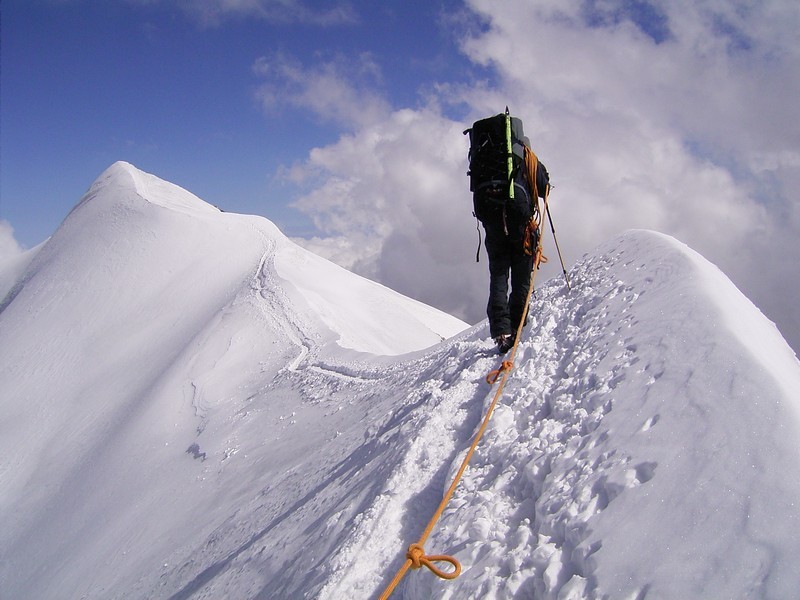 Vše klapalo parádně, až do té doby, kdy jsme z Malého Matterhornu vyšli do ulic!!! Z modré oblohy byla rázem mlhovina, a tak jsme v půli výstupu na Breithorn otočili a šli rovnou k bivaku pod Roccia Nera. Tam jsme byli nuceni strávit dvě noci a náš plán začal mít vážné trhliny! Péťa totiž po obě noci trpěl jakousi zmutovanou formou „jihoamerické mořské nemoci“ a tak v podstatě téměř dva dny čekal, jestli se to nezlepší! Já s Vojtkem jsme si mezi tím odskočili na dvě čtyřky nad bivakem a druhý den jsme se ráno společně vydali směr Pollux. Po chvíli se však Peťa rozhodl, že to pro jistotu nebude drtit, přecejen mu nebylo stále nejlíp, a tak jsme se rozdělili. My dále podle plánu a on zpět dolů do údolí, kde provozoval osamělé foto-toulky!