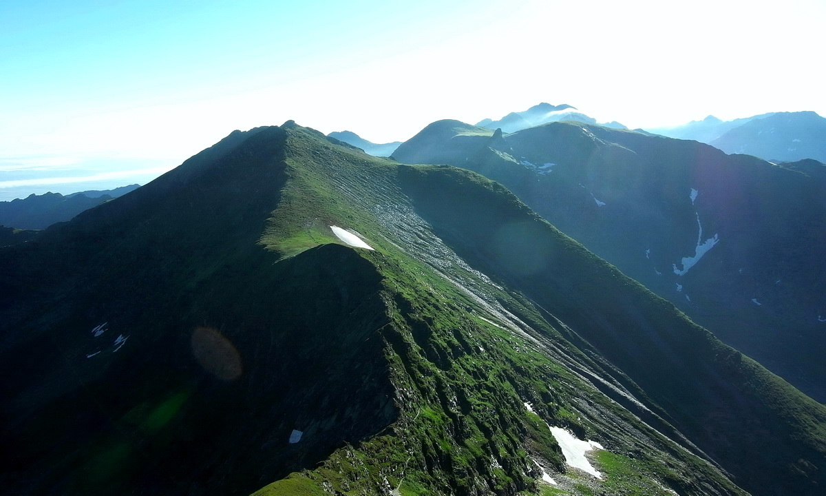 Čtvrtek 30.6. * Dnes sem měl, dle plánu, vycházet z Refugiul Fereastra… kterou bych ale nejspíš v tý včerejší viditelnosti stejně nenašel, takže vivat nová Caltun budka… luxusní zázemí!!! Holt teď zas trochu pokulhávám za plánem… a to doslova! Včerejší pohmožděná noha se kapánek rozležela a já mám problém se po ránu postavit :o( Levá holeň bolí jak čert… hlavně při sestupech!! Nu což, musím to rozchodit :o) O kus dál už sem obdivoval, v jakýchže terénech sme se onehdá v zimě vůbec pohybovali… no klobouk dolů :o)) Když se pak pode mnou objevily chajdy u jezera Balea, samou bolestí sem to chtěl vzdát a zbaběle sešourat dolů! Nakonec sem se ale nějak hecnul a dokulhal to až na Moldoveanu!!! Snad až na jednu větší zastávku u jezera Capra, kde sem nabral vodu, pojedl a vysušil pár věcí (kromě věčně mokrých bot), sem se nijak moc dlouze nezastavoval a zkrátka jen šel a šel…!! Při nechutným sestupu z Vf. Mircii sem se míjel s mladým bačou a jeho velepsem. Něco na mě spustil rumunsky, pak si zabouchal na hruď a pravil ‚Romania‘… já odvětil ‚Čechia‘! Podali sme si ruce… teda já ručku, on mi medvědí tlapu… usmáli sme se a pokračovali každej svojí cestou. Ta moje byla o nekonečným vytěsňování bolesti, jež mi zmítala nohou při každým došlapu!! Po téměř deseti hodinách od Caltunu sem se dobelhal na nejvyšší vrchol Rumunska, kde teď sedím, cpu se, větrám boty a píšu tyhle slinty :o) Kolem se převaluje oblačnost, kterou prosvěcuje sluníčko, který mě nekompromisně spaluje celej den a já si užívám neskutečno!! „This is the only time I really feel alive!“… přesně tak, jak mi před chvilkou broukal do ouška Trent! Úžasná hoďka na vrcholu!!! Už je ale třeba vyrazit směr Refugiul Vistea Mare… to musím dát, i kdybych si měl pajdrnožku připnout na bágl a odskákat to po pravý :o)) Sem tu… otevřu dveře a tam puch jak cyp!! Z nevábnýho odéru se vynoří rozchechtanej Belgičan a vedle hnedle druhej… rychlá kecačka a přichází třetí, co byl kajsik dole pro vodu… no to zas bude večírek :o)