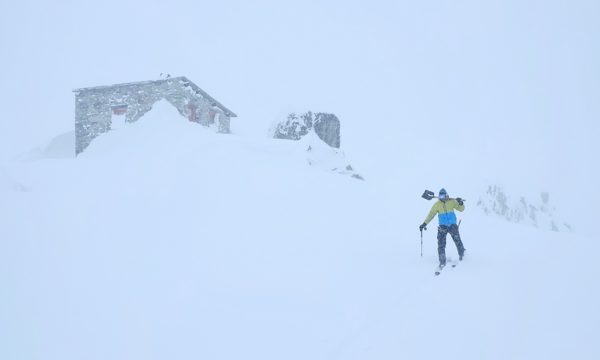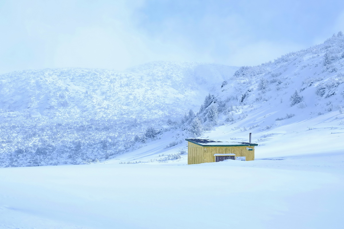 Dalšího rána máme v plánu přesun… podmínky na něj jsou vyloženě nesympatický… teplota je pořád hluboko pod bodem mrazu a viditelnost nulová. Ale co naplat, další ztracenej den už si nechceme dovolit a zítřejší solidní počasí raději využijem na ježdění… konečně. Trochu nás hřeje vědomí, že tu trasu už jsme párkrát šli… nicméně i tak v bílobílé mlze trochu bloudíme a já pak blahořečím svým haršajznám, páč bez nich bych tu klíčovou prudkou ledovou plotnu nad skalními srázy určitě nedal… nehledě opět na těžkej bágl, kterej na jistotě nepřidá… uff! Nakonec se nějak vymotáme na správnou trasu a po více jak čtyřech hoďkách jsme u spásný budky… tam si následně užijem krásnejch pět večírků.
