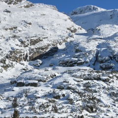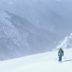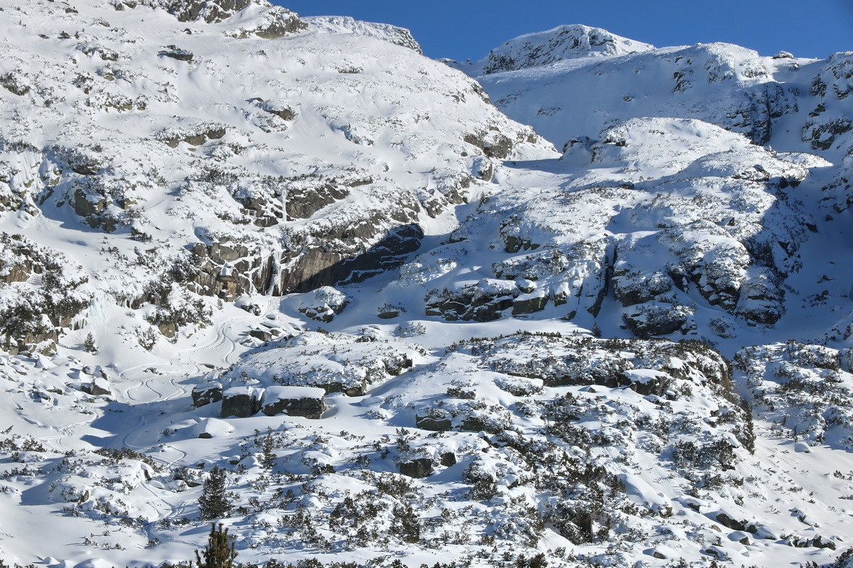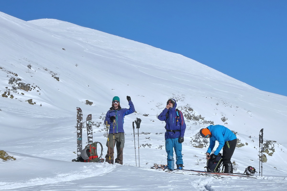 Po prvním oťukávacím dni, převážně v lesících, jdu následujícího rána se Svobym na pláně, na kterejch jsme tu euforicky čmárali vloni… kluci jsou ještě v budce, nemaj‘ na spěch. Jdeme notoricky známou trasou, po takový široký lehce ukloněný rampě dělící prudší svah. Jdu první, parťák odhadem tak 30-40 metrů za mnou, nevím přesně… každopádně je to akorát tolik, aby se mezi nás tak tak vlezla masa sněhu, která se s řádným hukotem zřítila pár metrů za mnou do míst, přes který jsem právě prošel! Ohlídnu se a koukám na Svobyho, kterej se na pásech snaží neohrabaně couvat… i tak ho kraj laviny líznul a strhnul o několik metrů níž. Bejt to celý načasovaný o pár sekund dřív či pozdějc, tak by to veselý nebylo… kusy trhající se desky nebyly rozhodně z nejmenších! UFFF!! Na to konto hbitě měníme plán a vzápětí se spouštíme dolů ne tak prudkým svahem… tohle varování nám stačilo!